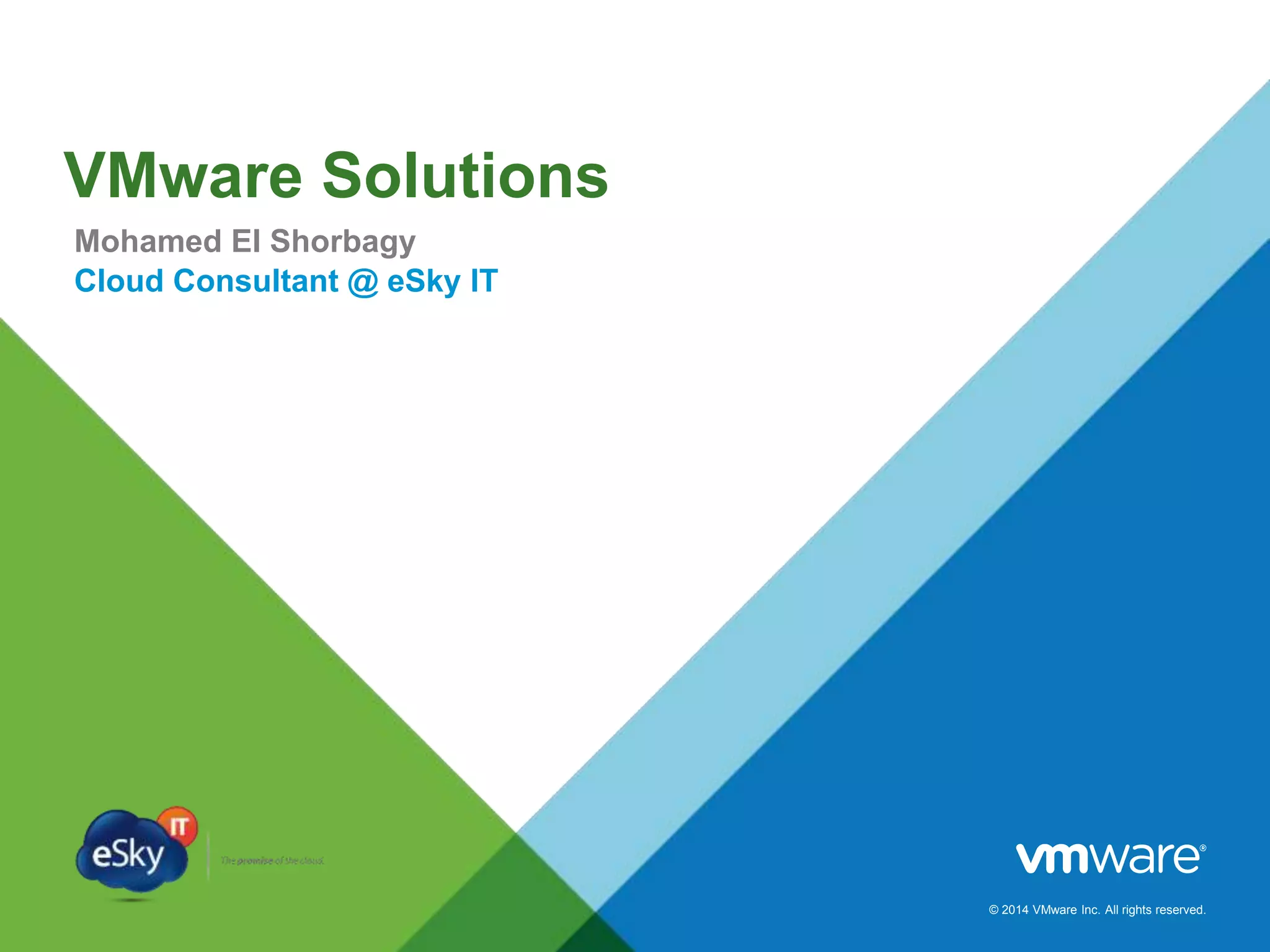 This document provides an agenda and overview of VMware solutions that can be presented, including profiles of eSky IT and VMware's vision, as well as discussions of VMware vSphere, vCloud Suite, vCenter Operation Manager, and VMware Health Check Service. Key aspects of the VMware software-defined data center approach are explained such as abstracting, pooling, and automating infrastructure resources.