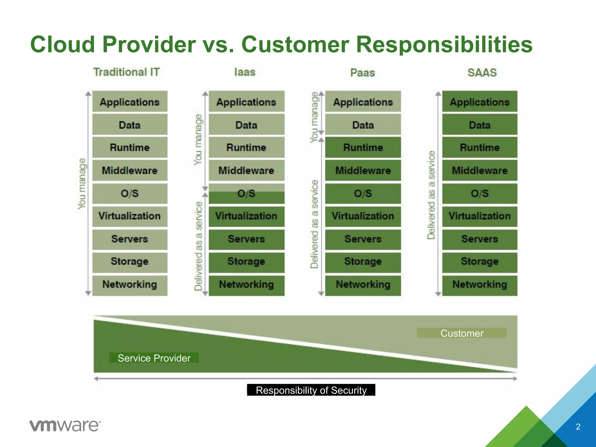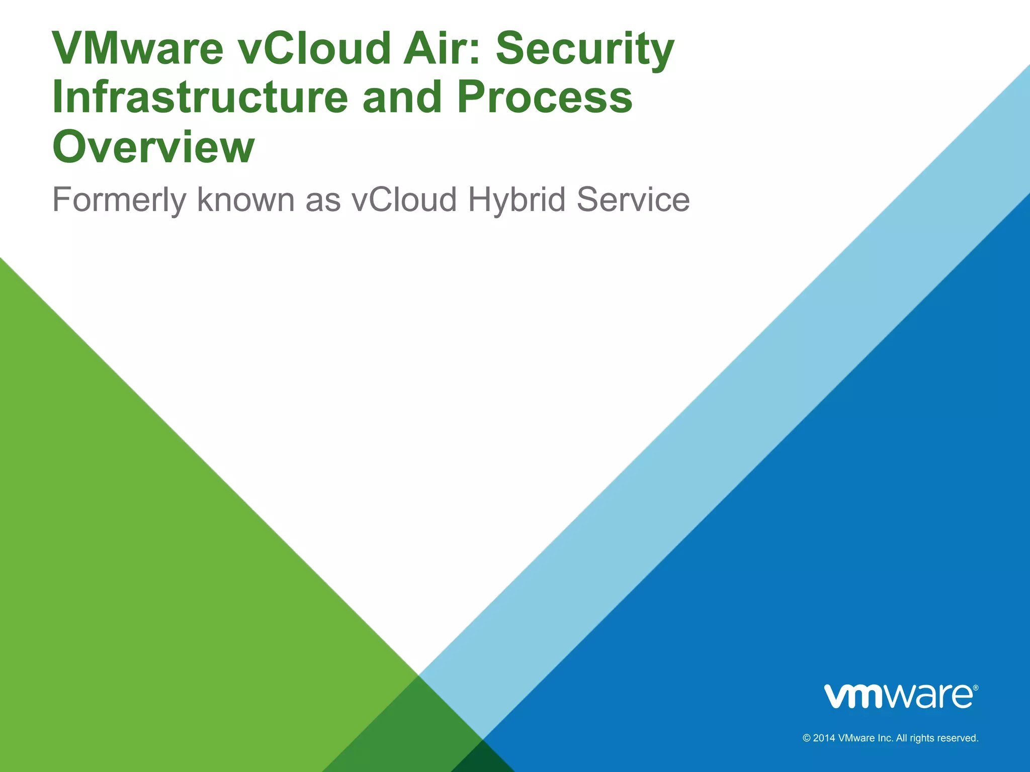 The document outlines VMware vCloud Air's security infrastructure and shared responsibility model between the service provider and customer. It emphasizes the ability to integrate existing security measures and maintain seamless networking and security policies across cloud environments. Additionally, it lists compliance certifications and resources for further learning about vCloud Air's security features.