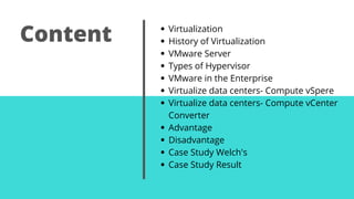 VMware provides virtualization software that allows guest operating systems to run on virtual machines. This makes virtual machines highly portable between physical computers. Administrators can pause, move, or copy virtual machines. Virtualization treats hardware as a pool of resources available on demand. VMware was founded in 1999 and initially developed virtualization in the 1960s for mainframe computers. It offers two types of hypervisors - Type 1 is a bare metal hypervisor directly on hardware while Type 2 is hosted on a traditional operating system. VMware helps enterprises consolidate servers, provision applications quickly, isolate workloads, enable disaster recovery, and reduce costs. Welch's Foods case study showed VMware helped save over $100,000 by migrating servers to