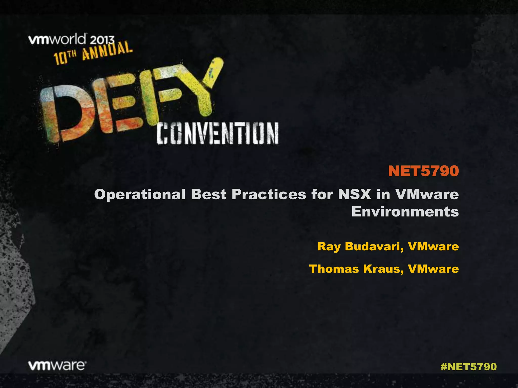 The document outlines operational best practices for using NSX in VMware environments, focusing on network virtualization, operational impacts, and available tools. It discusses the benefits of decoupling physical and virtual networks, troubleshooting strategies, and automation capabilities through NSX components. Additionally, the document details various operational tools for monitoring, troubleshooting, and maintaining network health within VMware environments.