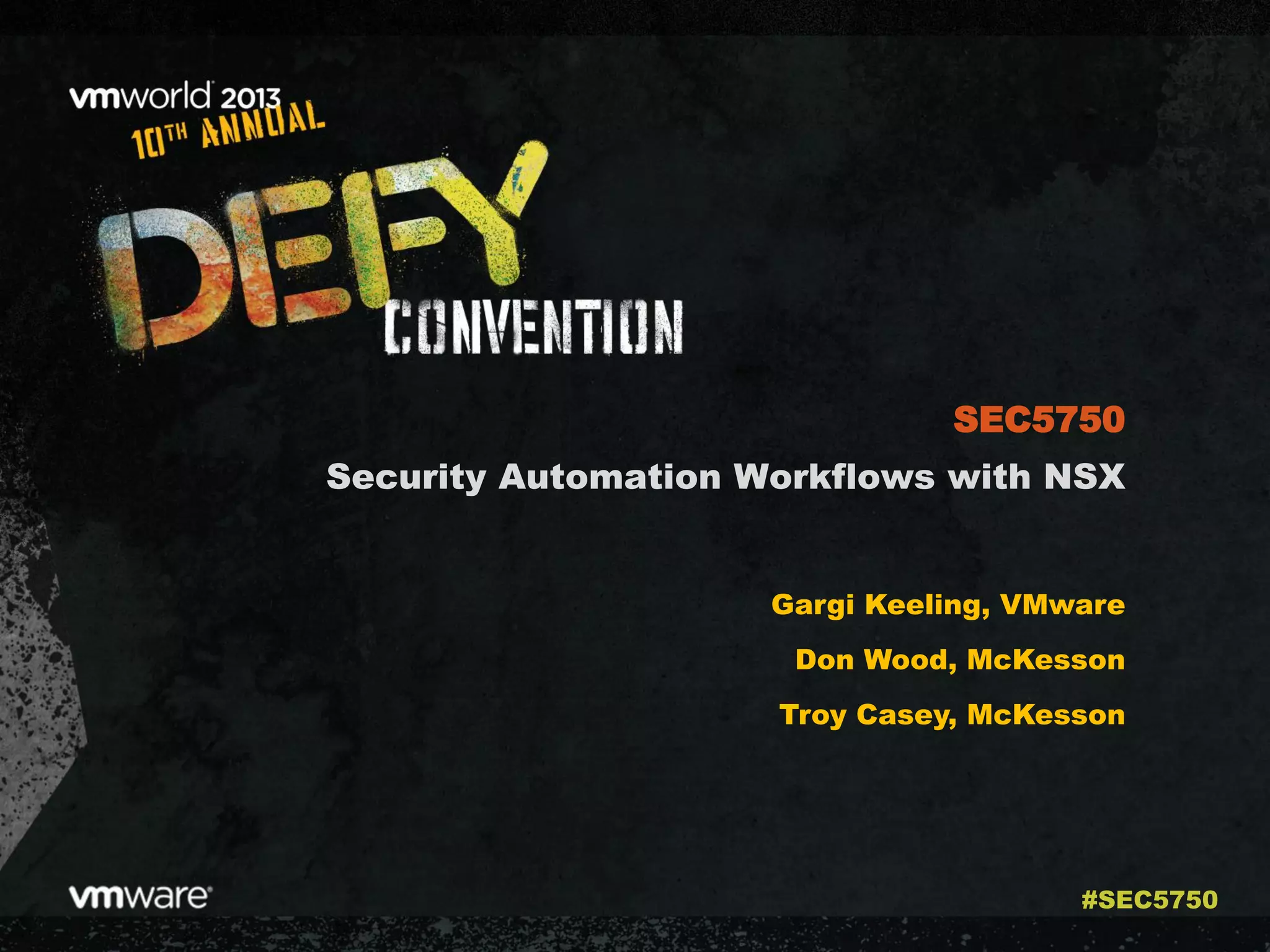 The document discusses the automation of security workflows using VMware's NSX Service Composer, emphasizing efficiency and consistency in handling security issues. It outlines a step-by-step approach to automate quarantine processes for infected systems and outlines the integration of compliance and vulnerability management workflows. Additionally, it highlights the benefits and capabilities of NSX in a software-defined data center, along with a case study on McKesson's use of the OneCloud platform.