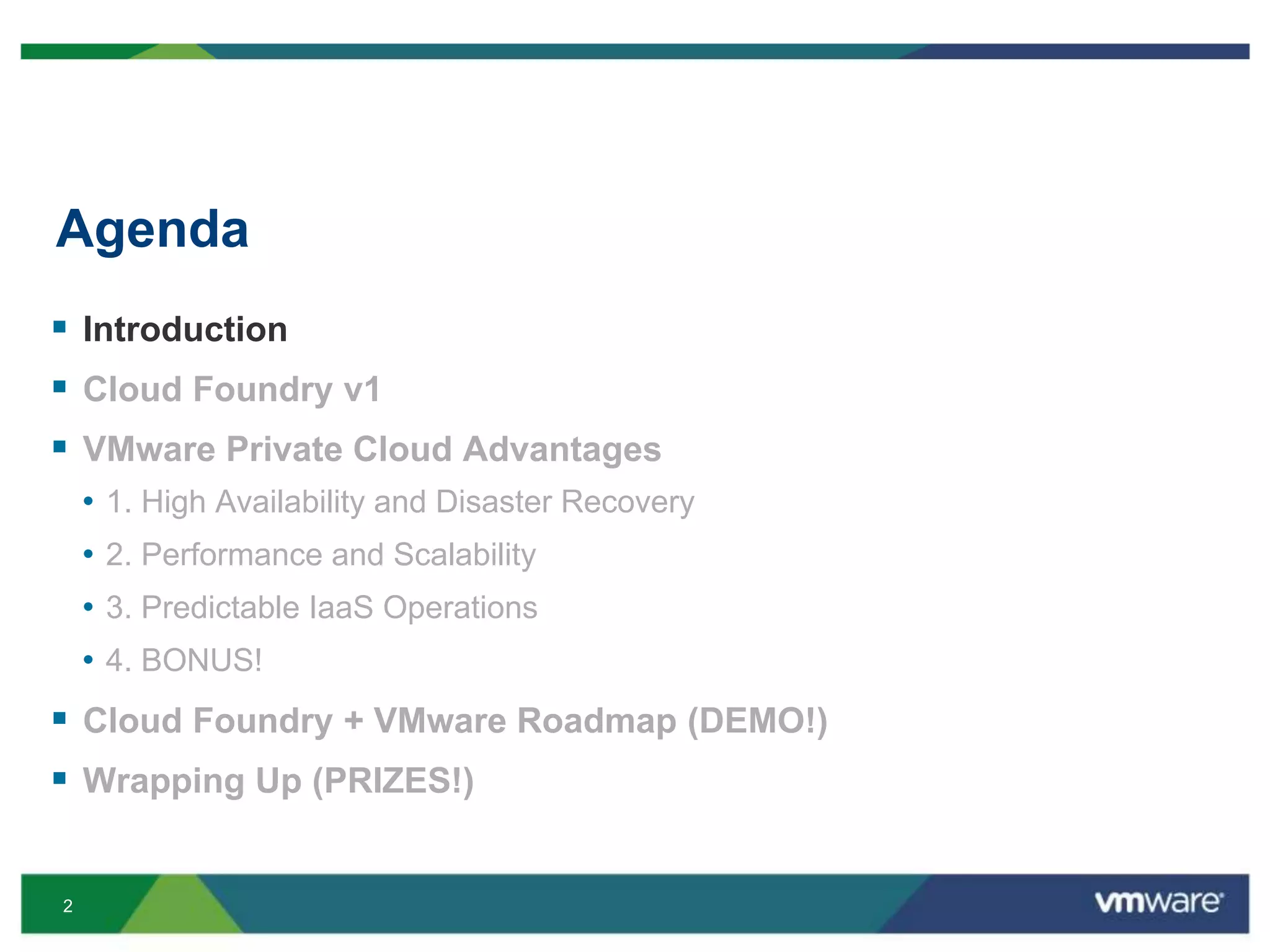 The document outlines three primary advantages of running Cloud Foundry in a VMware private cloud: high availability and disaster recovery, performance and scalability, and predictable IaaS operations. It emphasizes the importance of infrastructure in managing cloud services and addresses the benefits of hybrid cloud. The presentation concludes with a roadmap for integrating Cloud Foundry with VMware products.