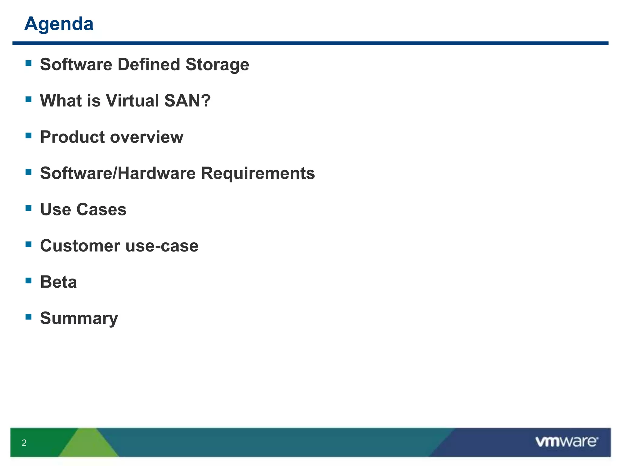 The document provides an overview of VMware's Virtual SAN (vSAN), a software-defined storage solution integrated with vSphere that enables efficient management of storage resources. It highlights key features such as high performance, scalability, resilience, and policy-driven management principles, aimed at reducing costs and complexity in data centers. Additionally, it outlines specific use cases, requirements, and customer experiences with vSAN, particularly emphasizing its advantages for virtual desktop infrastructure (VDI) and private cloud environments.
