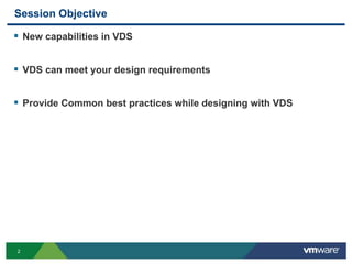 The document outlines the design and best practices for using VMware's vSphere Distributed Switch (VDS), highlighting its new capabilities and enhancements in version 5.5. It covers various aspects such as deployment strategies, infrastructure design goals, security measures, performance issues, and the importance of using features like Network I/O Control (NIOC) and Load Based Teaming (LBT). Additionally, it provides recommendations for ensuring reliable, secure, and scalable virtual network architecture.