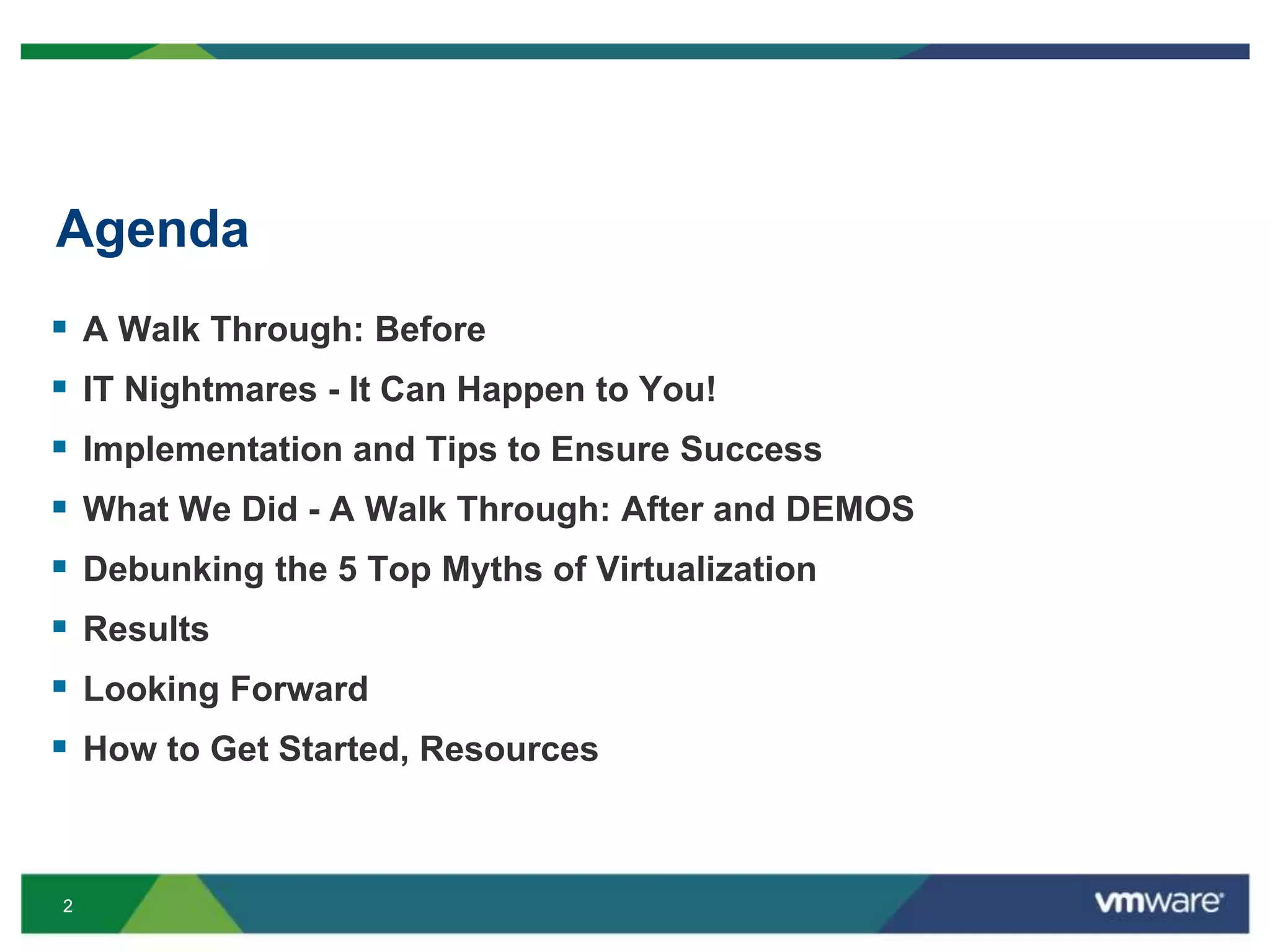 The document outlines a comprehensive IT makeover process undertaken by PBS Engineering and Environmental, detailing the transition from a traditional to a virtualized IT infrastructure. Key sections highlight the challenges faced, the implementation timeline, and the resulting benefits such as reduced server count, enhanced performance monitoring, and increased reliability. The presentation also addresses common misconceptions about virtualization and provides steps for organizations looking to start their own transformations.