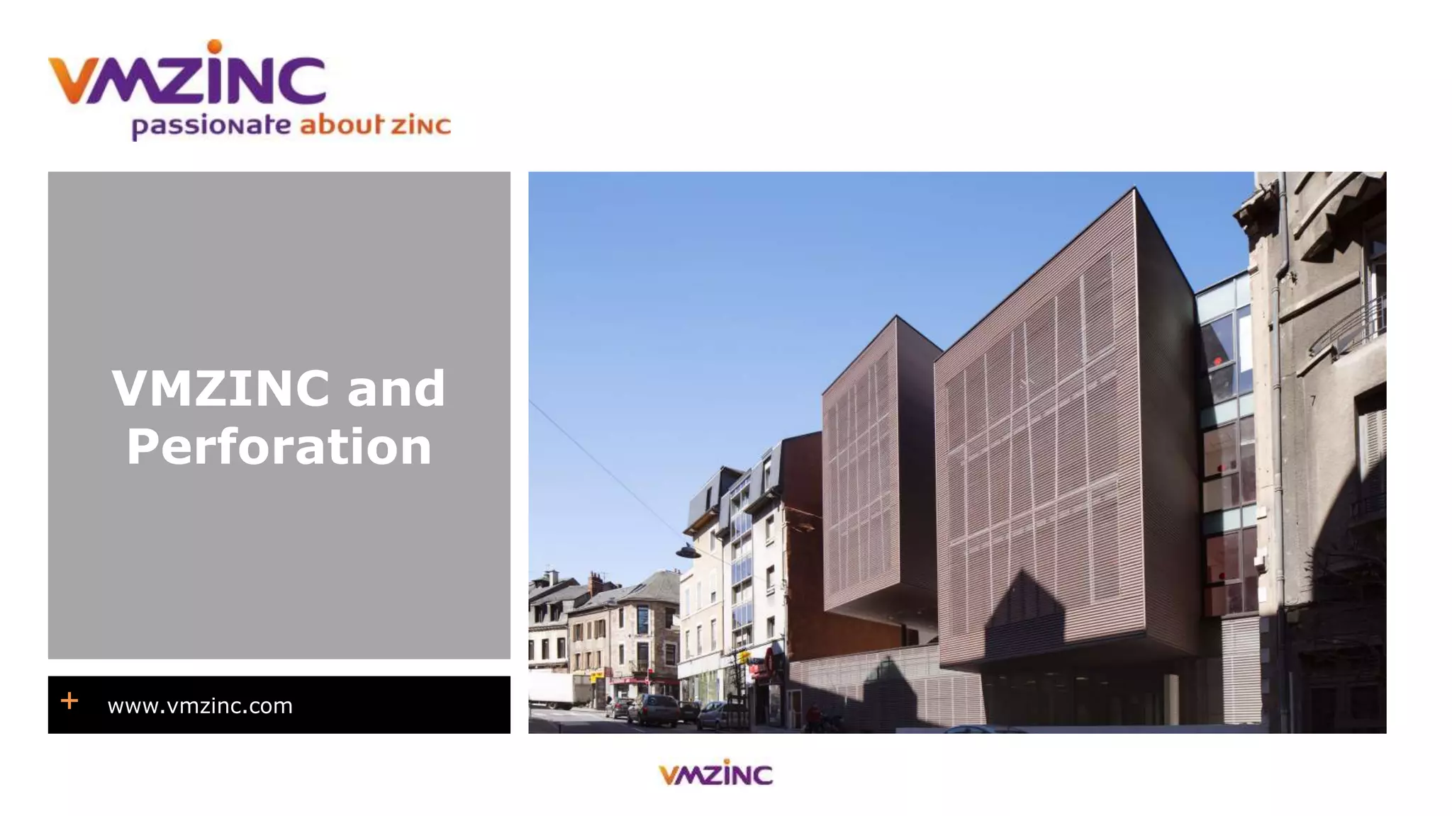 The document lists various architectural projects that utilize VMZinc perforated and interlocking panels made from quartz-zinc and other materials across different countries. Notable projects include educational buildings, commercial structures, and public facilities in locations such as France, the USA, and Spain. Each entry highlights the collaboration with architects and the specific type of panel used.
