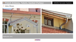 The document lists various projects utilizing VM Zinc rainwater systems across multiple countries, including notable structures in Turkey, Switzerland, France, the USA, and Poland. It highlights different architectural firms and the specific finishes or types of zinc used for each project. Each entry includes information about the project's name, location, and the associated design firms.