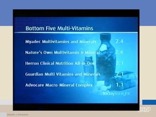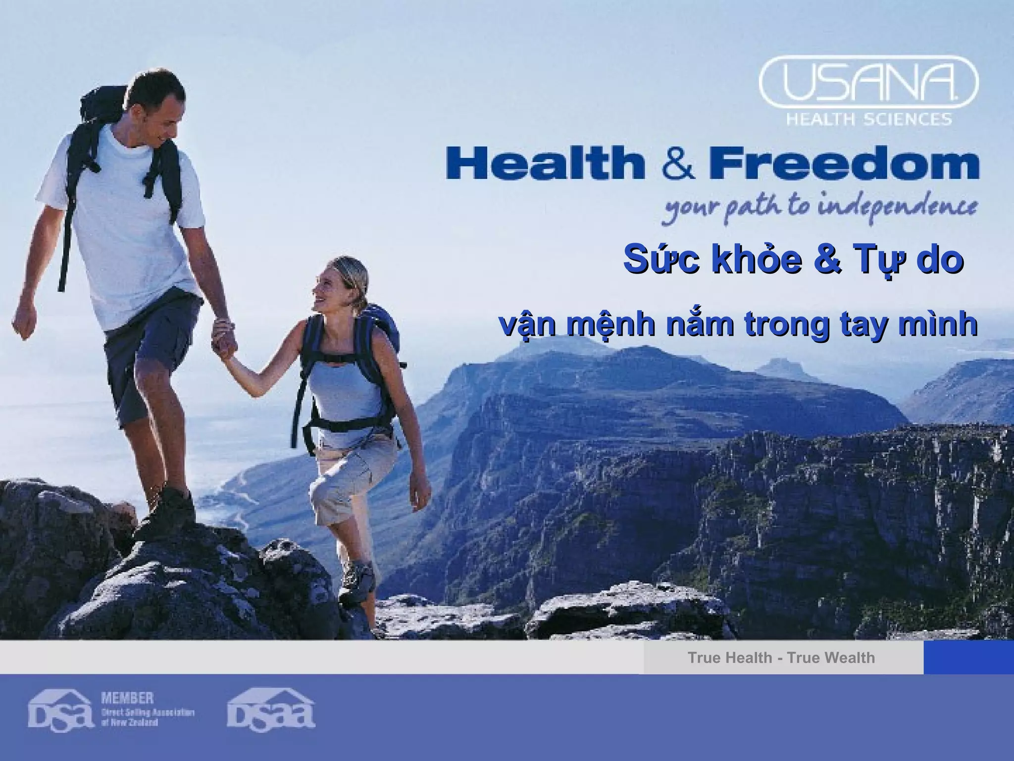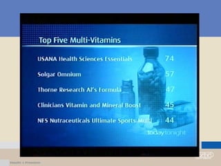 Tài liệu bàn về sức khỏe và dinh dưỡng, nhấn mạnh tầm quan trọng của việc cung cấp chất dinh dưỡng cho cơ thể để phòng ngừa bệnh tật và duy trì sức khỏe. Nó cũng đề cập đến sự gia tăng các bệnh mãn tính do thiếu hụt dinh dưỡng và áp lực từ môi trường. Hơn nữa, các sản phẩm dinh dưỡng của Usana được giới thiệu như giải pháp cho vấn đề này.