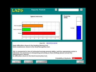 This document discusses various methods for screening, diagnosing, and assessing needs related to dyslexia. It describes several screening tests and checklists that can provide initial indicators of dyslexia. It also discusses standardized tests that can further assess areas like reading, spelling, and working memory. However, it notes limitations of screening tests and standardized assessments, as they only provide snapshots of performance and may not fully capture needs. The document advocates for a more comprehensive needs assessment approach over single diagnostic events. It highlights the role of educational psychologists and mentors in conducting thorough assessments that consider individual needs and contexts rather than just deficits.