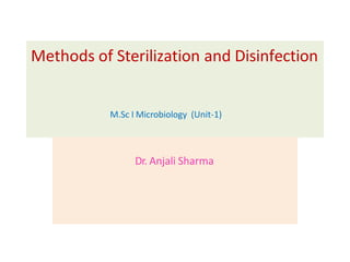 The document provides a comprehensive overview of sterilization and disinfection methods in microbiology, detailing definitions and applications of sterilization, disinfection, antisepsis, and related terms. It outlines various physical and chemical methods of sterilization, including heat, radiation, filtration, and specific techniques like pasteurization and autoclaving. Important factors affecting sterilization efficacy, such as temperature, time, and microbial resistance, are also discussed.