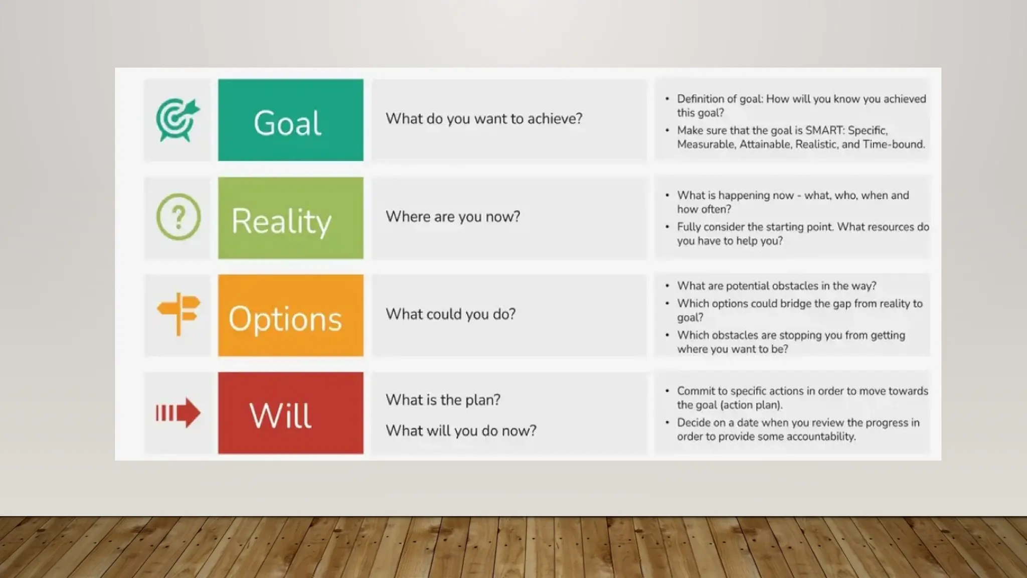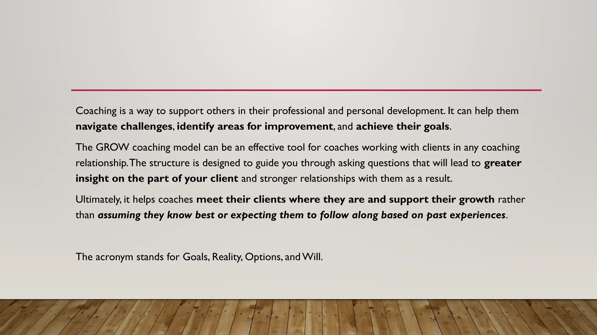 The GROW coaching model supports personal and professional development by guiding clients through a structured inquiry that enhances self-awareness and accountability, ultimately facilitating goal achievement. While effective in increasing performance and communication, the model has limitations such as the necessity for realistic goal setting and the coachee's motivation. Various coaching styles and additional models, like O.S.K.A.R. and CLEAR, offer frameworks tailored to different coaching objectives and contexts.