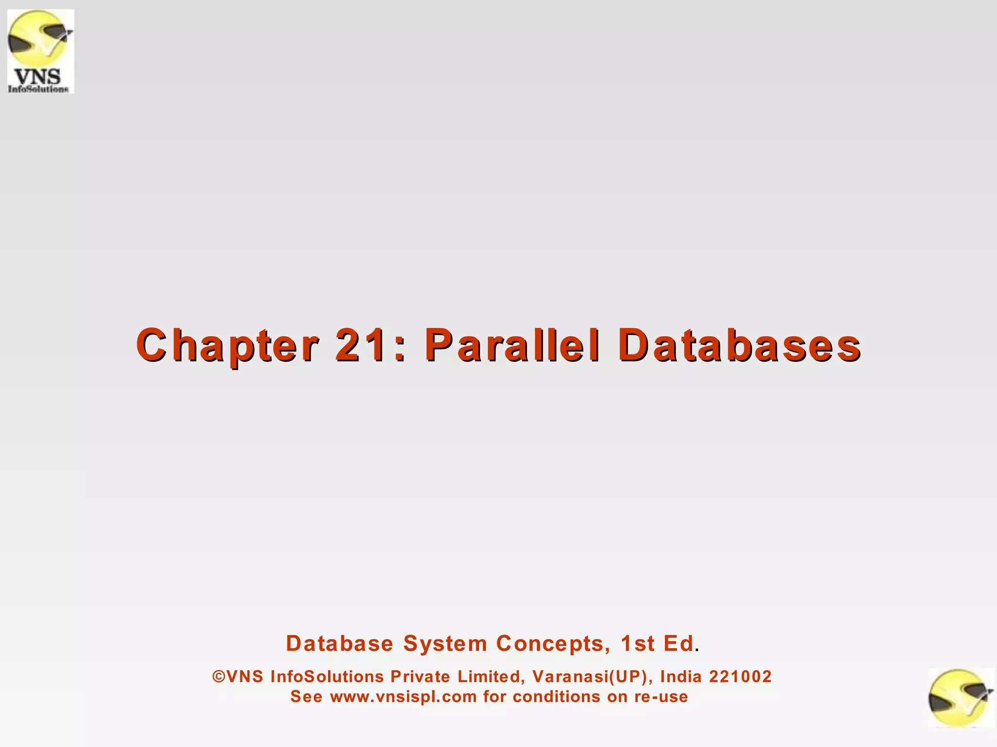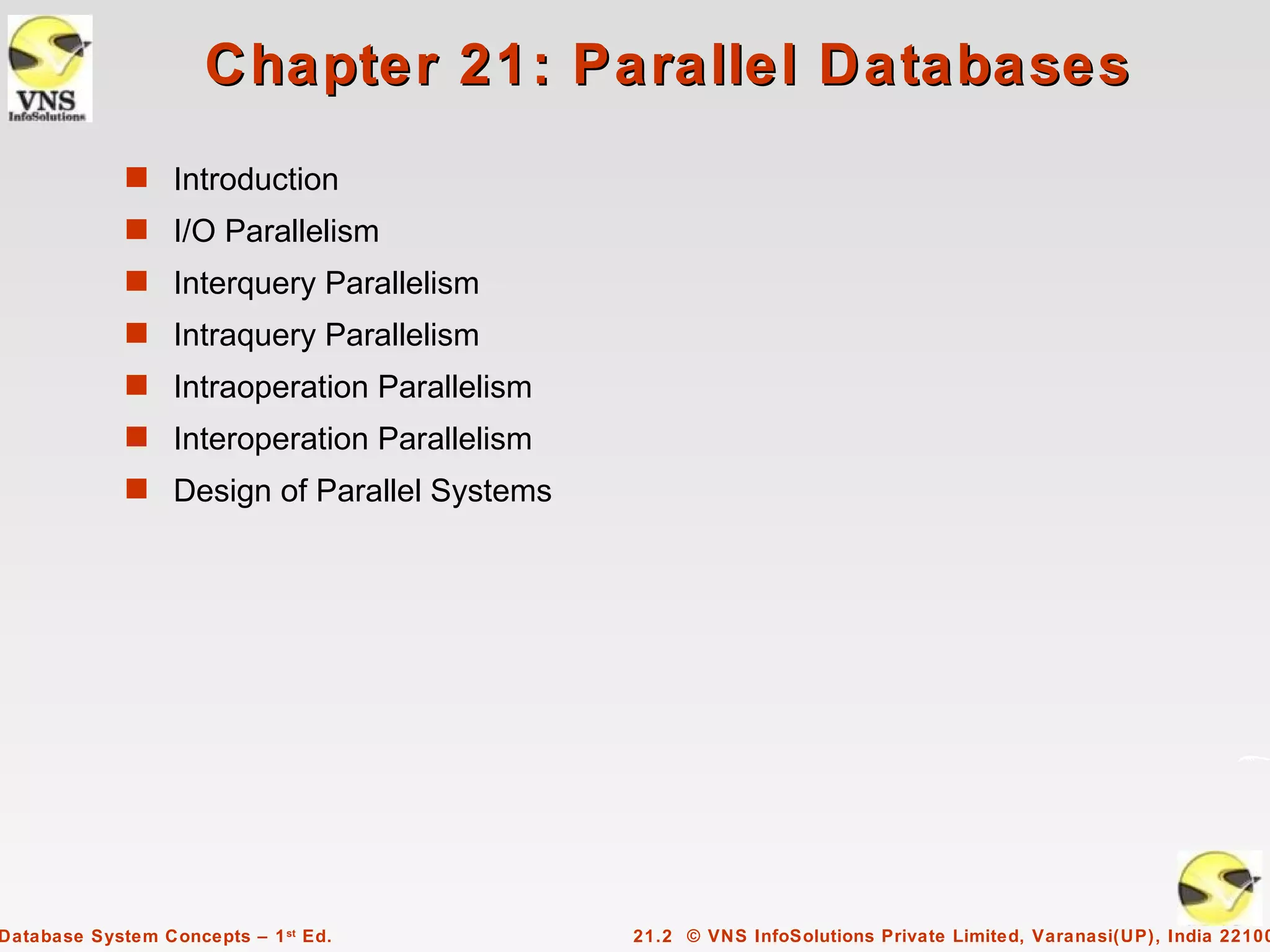 Chapter 21 discusses parallel databases, emphasizing the increasing affordability of parallel machines and the growing volume of data in databases. It elaborates on various types of parallelism including I/O, interquery, and intraquery parallelism, as well as techniques for partitioning data across multiple disks to enhance query performance. Additionally, it covers the handling of data skew and techniques such as fragment-and-replicate joins for efficient query execution.