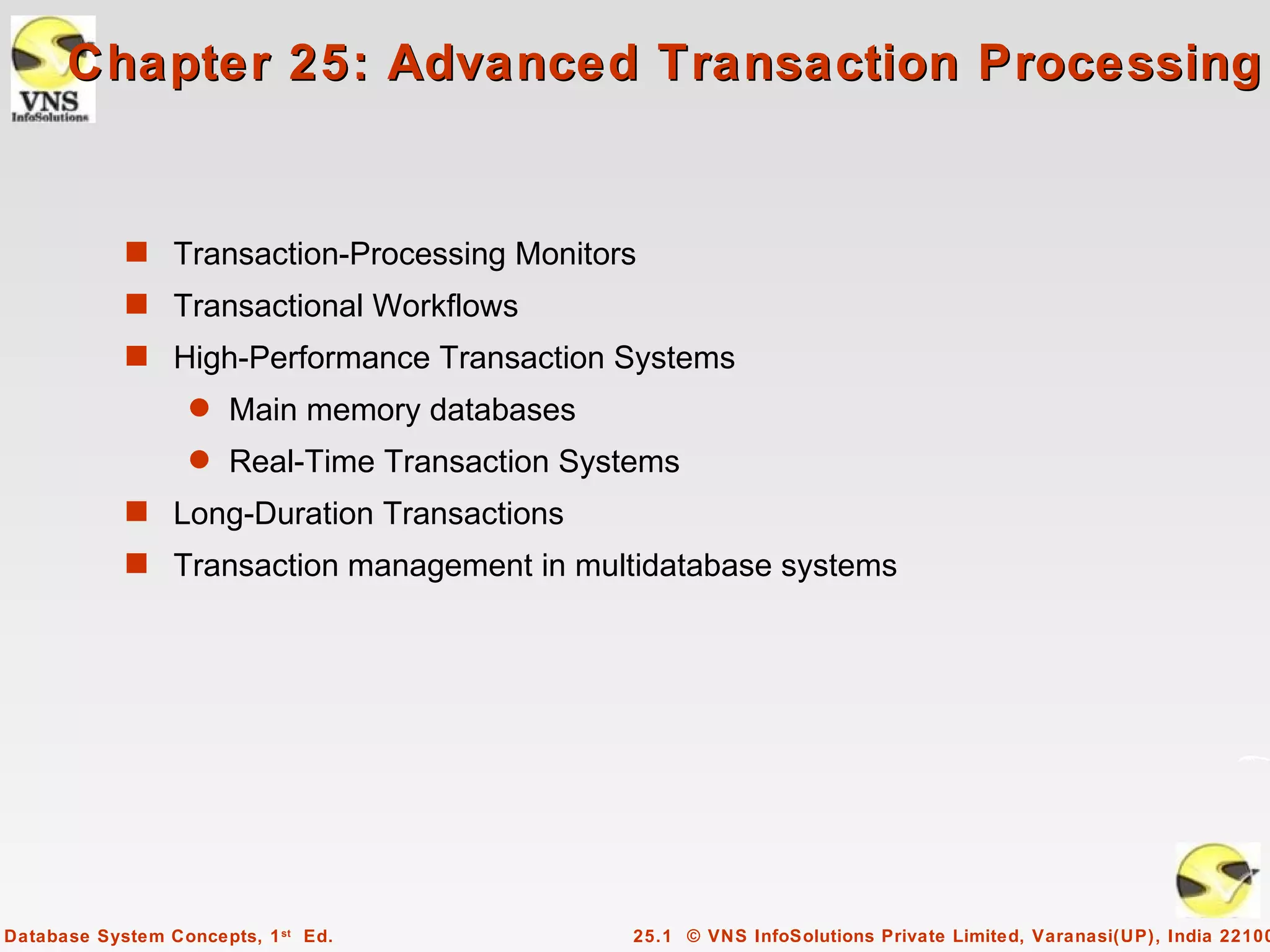 This document discusses advanced transaction processing concepts including: