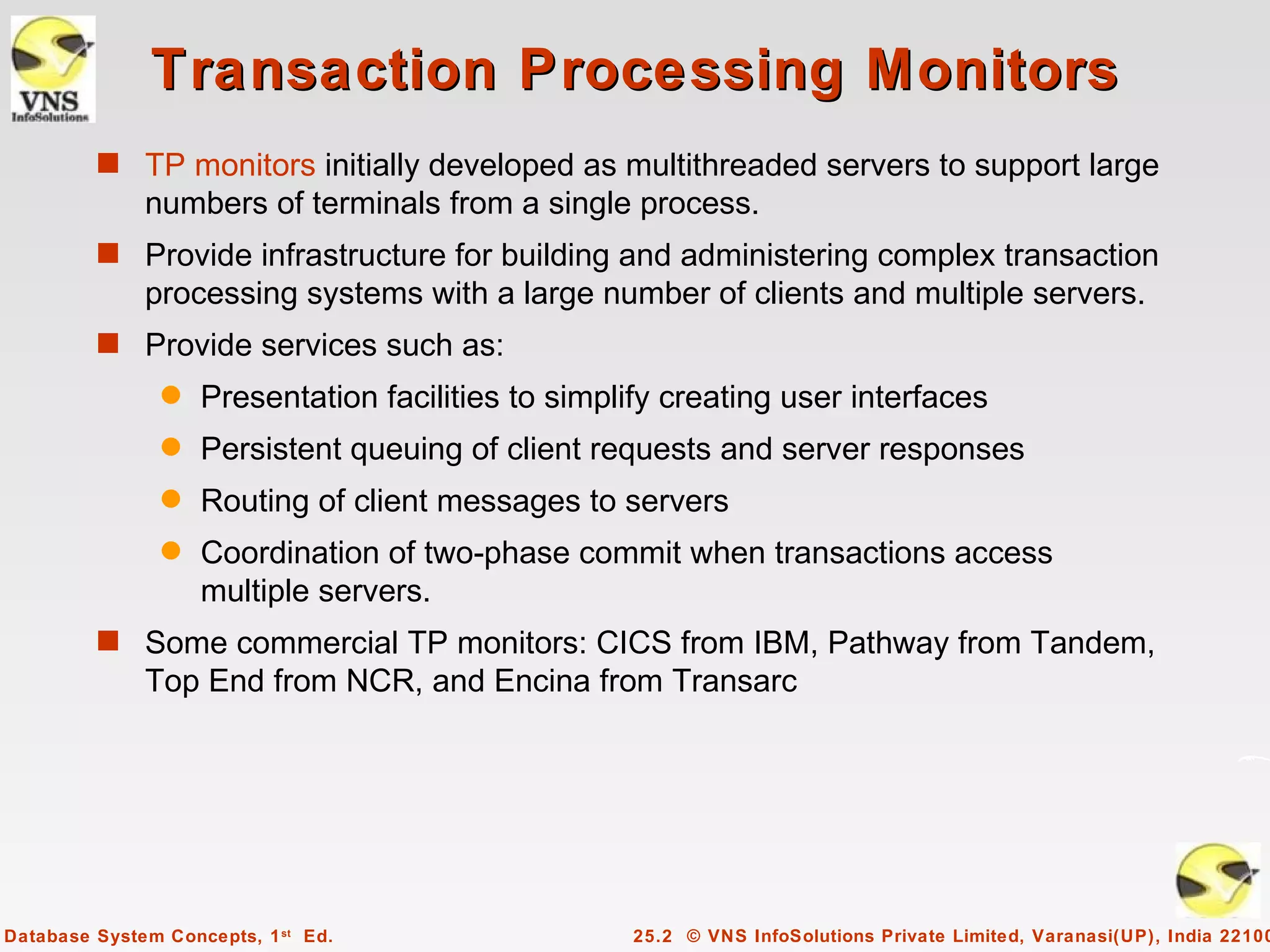 1) Transaction processing monitors that provide infrastructure for complex transaction systems.