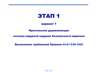 Документ описывает проект разработки фронтальной удерживающей системы надувных подушек безопасности для автомобиля Лада Приора с участием компаний из Эстонии и Швеции. Он включает технические детали, такие как характеристики газогенераторов, конструкцию подушек безопасности и электронных блоков управления, а также изображает процесс надува подушки и ее работу. Кроме того, упоминается о будущих планах усовершенствования системы и получении сертификаций по стандартам безопасности.