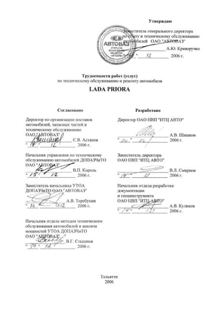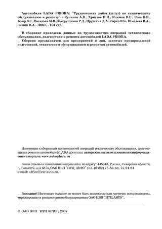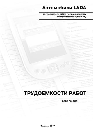 Документ содержит данные о трудоемкостях операций технического обслуживания и ремонта автомобилей Lada Priora. Он предназначен для специалистов и предприятий, занимающихся предпродажной подготовкой и обслуживанием данных автомобилей. В сборнике представлены подробные категории работ и услуги, имеющие отношение к техническому обслуживанию и диагностике.