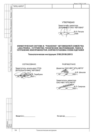 Документ представляет собой технологическую инструкцию по обслуживанию и ремонту климатической системы автомобилей Lada Priora, выполненной на основе системы кондиционирования Panasonic. В инструкции подробно описаны характеристики устройств, порядок проведения технического обслуживания, требования безопасности при работе с хладагентом, а также идентификация и устранение возможных неисправностей. Технические рекомендации сопровождаются графиками и схемами, что способствует лучшему пониманию и выполнению работ.