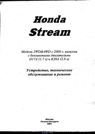 Документ содержит информацию о технических характеристиках и обслуживание автомобилей Honda Stream, выпущенных с 2000 года. В нем описаны двигатели, их мощность, крутящий момент, а также предостережения и инструкции по ремонту и эксплуатации. Также даны советы по безопасности при выполнении работ с автомобилем, включая меры предосторожности при контакте с электрооборудованием и маслом.
