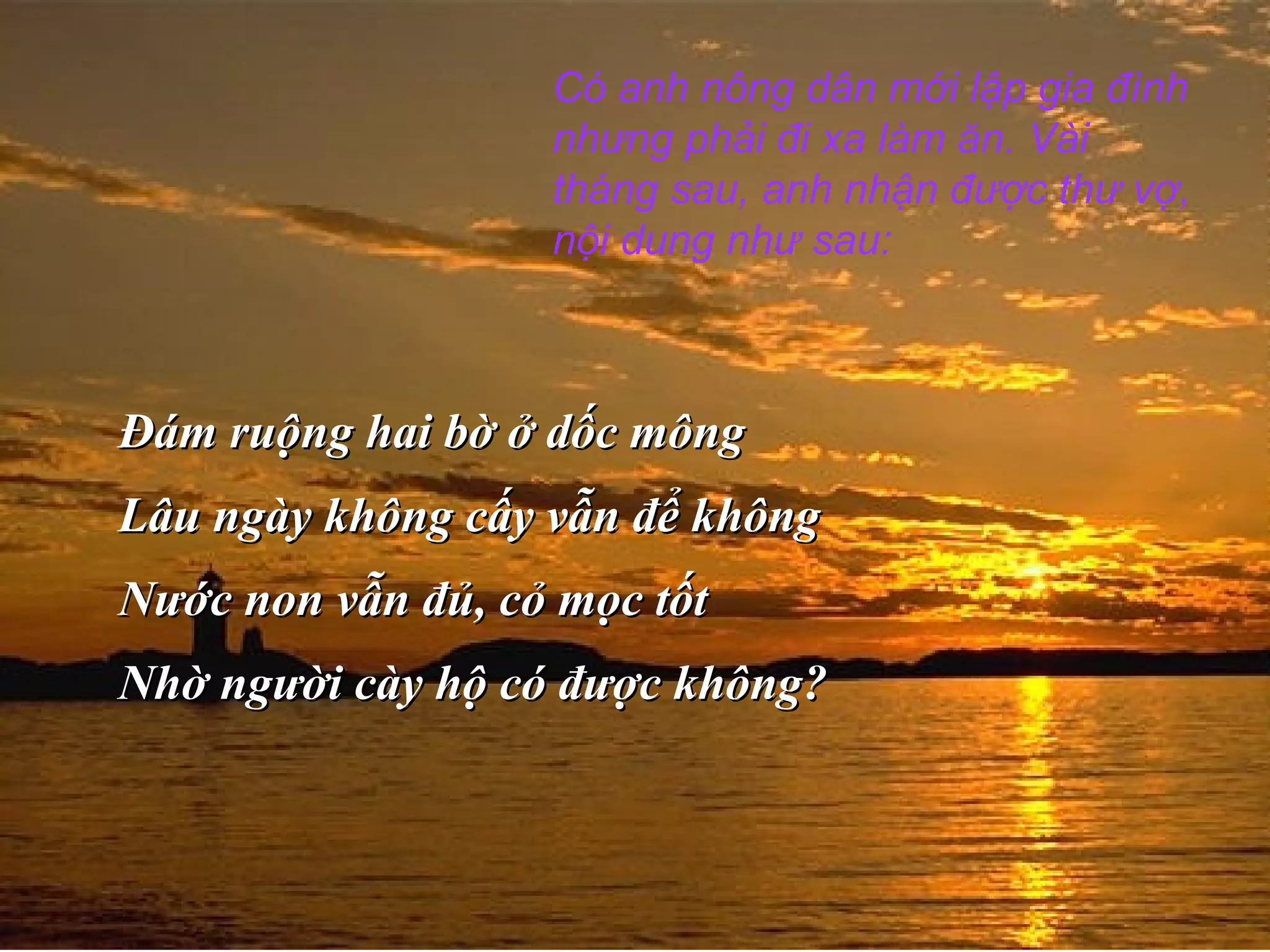 Một câu chuyện về một cặp vợ chồng nông dân, trong đó người vợ cố gắng thuyết phục chồng cày cấy ruộng trong khi chồng ngó lơ và từ chối nhờ người khác cày hộ. Cuối cùng, người vợ gửi thông điệp khẩn cấp cho chồng rằng theo luật mới, ruộng không cấy sẽ bị sung công. Cuộc tranh luận giữa họ phản ánh sự khác biệt trong quan điểm về công việc và trách nhiệm trong nông nghiệp.