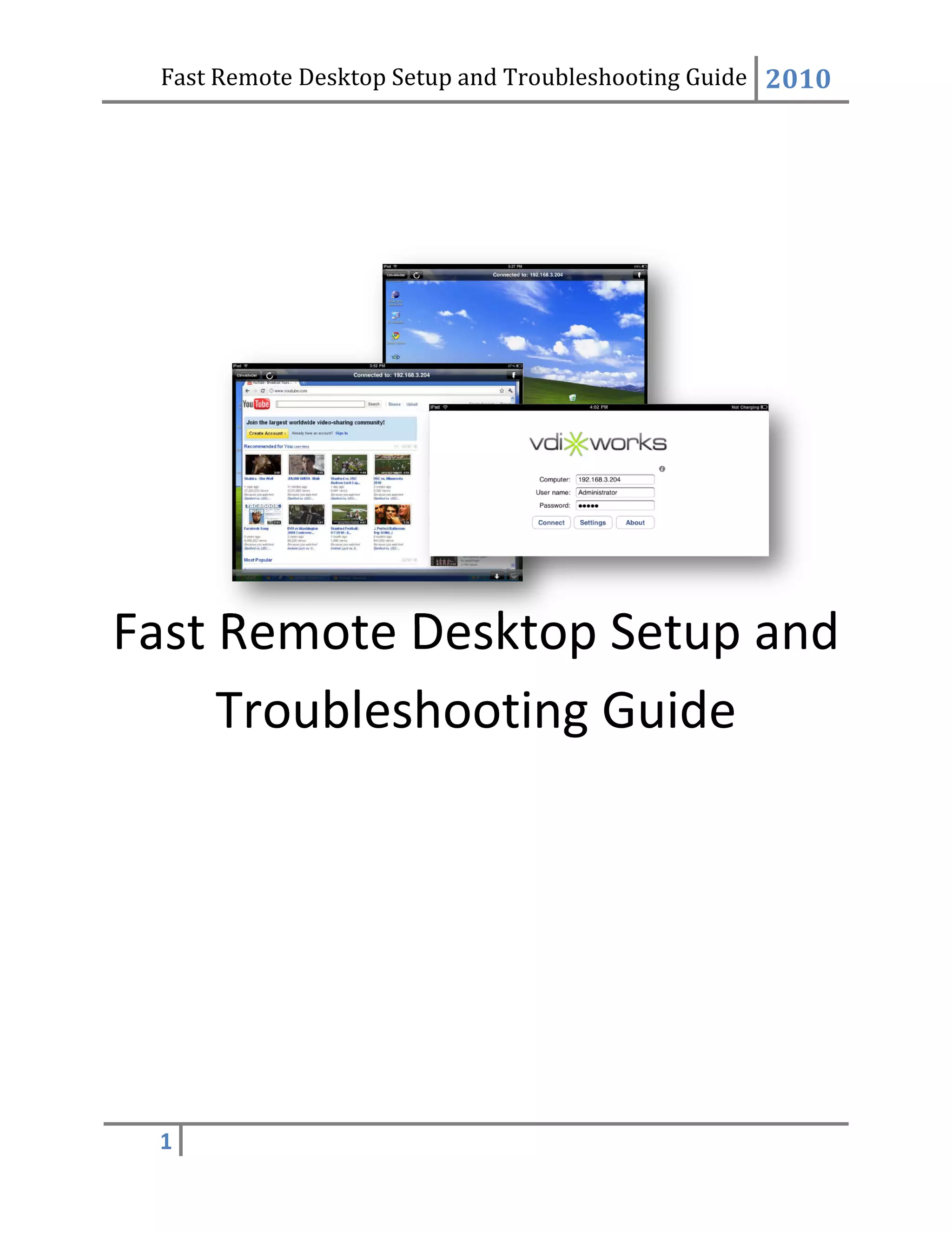 This document provides instructions for setting up and troubleshooting Fast Remote Desktop, which allows controlling a Windows PC from an iPad. It includes steps to install the VideoOverIP software on the PC, find the PC's IP address, enter login credentials in the iPad app, and check that the VOIP service is running. It also provides guidance on port forwarding for remote connections and checking the iPad's network connectivity and IP address.