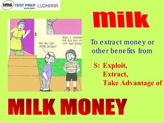 The document provides definitions for 10 words: milk, opulent, ornate, ostentatious, paucity, solvent, squalor, urbane. It lists the part of speech or language of origin before defining each word with 3 short synonyms or explanations of their meaning.