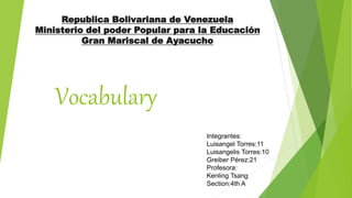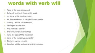 This document contains a vocabulary exercise with 35 sentences using verbs like "will" and "going to" to describe different occupations. It was created by the Ministry of Popular Power for Education in Venezuela for Luisangel Torres, Luisangelis Torres, and Greiber Pérez, who are students in Kenling Tsang's 4th A section class. The exercise provides sentences describing people's current and future jobs as accountants, air hostesses, architects, bricklayers, businessmen, caretakers, cashiers, consultants, cooks, counselors, chemists, dressmakers, garbage collectors, firemen, florists, journalists, glass cleaners, lawyers, librarians, lifeguards, truck drivers, nannies
