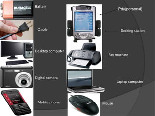 Carlos Moreira documented the connections between various technology devices including personal digital assistants, batteries, docking stations, desktop computers, fax machines, digital cameras, laptop computers, mobile phones, mice, scanners, projectors, printers, monitors, towers, CD/DVD drives, keyboards, and mice. The diagram showed how these devices connect through cables, wires, USB ports, and other plugs and sockets.