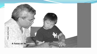 1) Effective vocabulary instruction involves directly teaching words through multiple methods like definitions, examples, discussions and activities rather than relying solely on definitions. 2) Vocabulary is best learned through repeated exposure, active engagement and connecting new words to prior knowledge. 3) Teachers should introduce new words, help students understand and represent word meanings in different ways, and provide opportunities for students to deepen their knowledge of words over time.