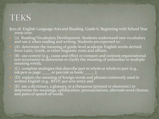 The document outlines vocabulary development standards for 6th grade English Language Arts and Reading according to the Texas Essential Knowledge and Skills curriculum. It specifies that students should be able to determine meanings of words with Latin, Greek or other linguistic roots; use context clues to understand unfamiliar words; and use reference sources like dictionaries to define words.