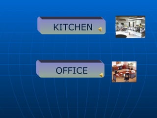 The document contains vocabulary related to various topics including the kitchen, office, machinery, tools, raw materials, products, and jobs. It includes lists of words and terms for these areas and activities to match certain items.