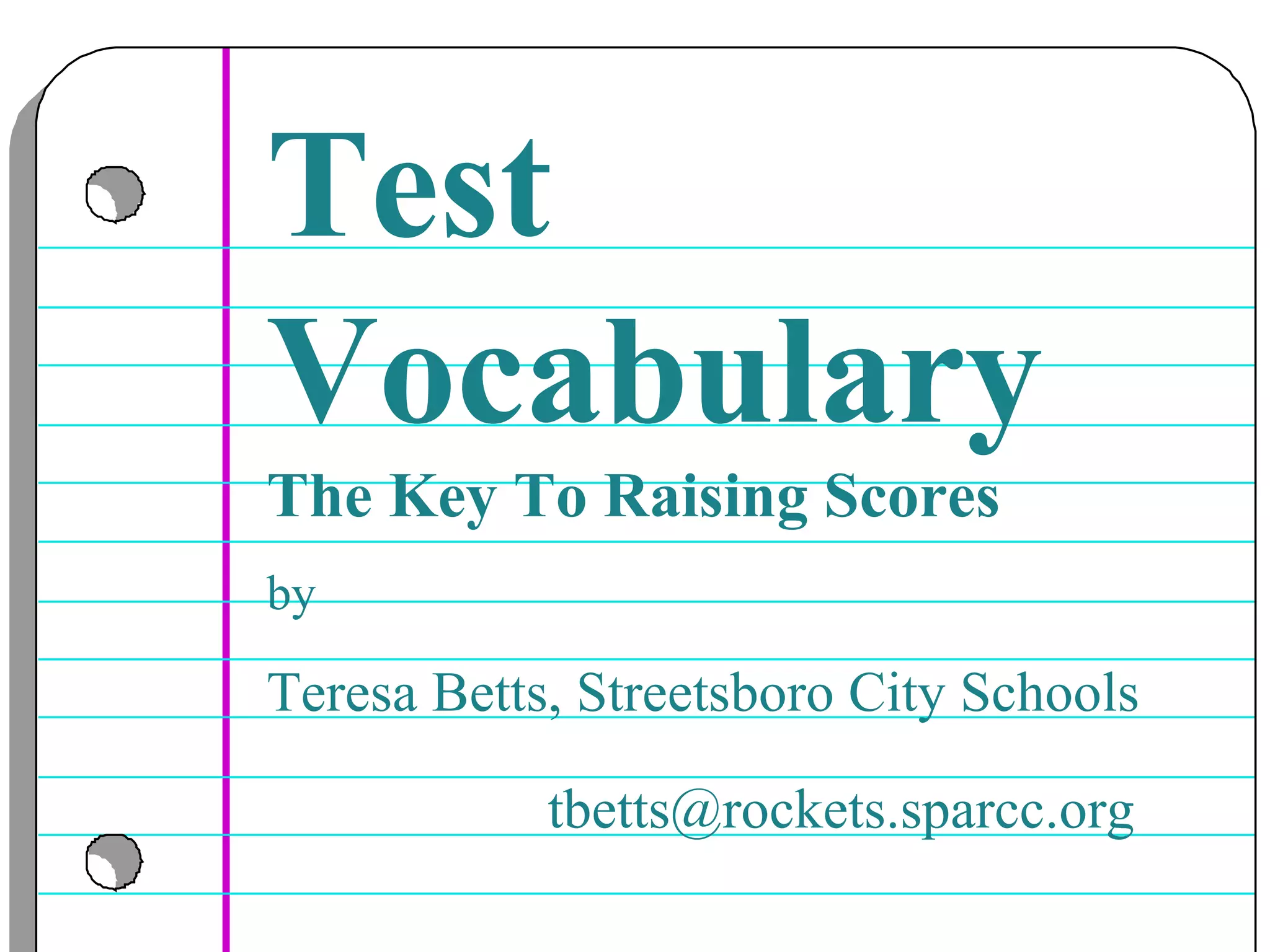 The document provides vocabulary words that may appear on standardized tests across various subject areas such as science, social studies, math, writing, and reading. It defines 58 vocabulary words and provides an example sentence for each. The definitions are intended to help students learn essential test vocabulary to potentially raise their scores. It notes that the list is not comprehensive and encourages adapting the material while properly citing it.