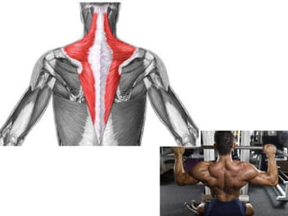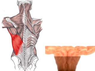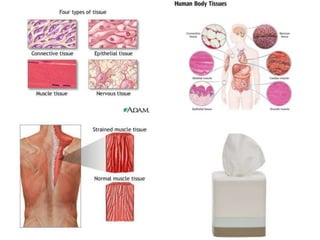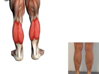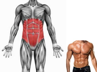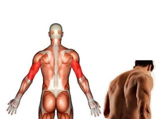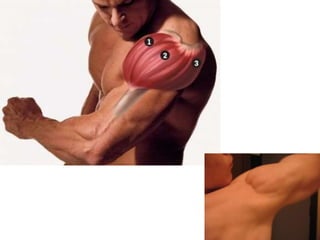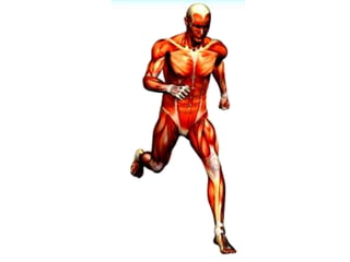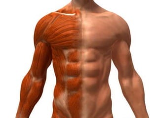 The document discusses the main components and functions of the muscular system in humans. It mentions that muscles are made of bundles of fibres that work together as tissue to allow movement. Muscles connect to bones via tendons and work in pairs like the biceps and triceps to flex and extend the arms. Key muscle groups mentioned include the abdominals, quadriceps, trapezius, deltoids, dorsals, calves, gluteus, and muscles that cause goosebumps.