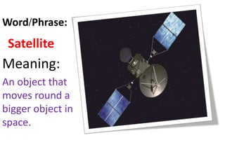 This document defines key terms related to space, the environment, and natural phenomena. It provides definitions for universe, satellite, space, climate, human, crops, lava, wild, gas, and drown, with universe defined as the whole of space and everything in it, including planets and stars. Satellite is defined as an object that orbits a larger object in space.