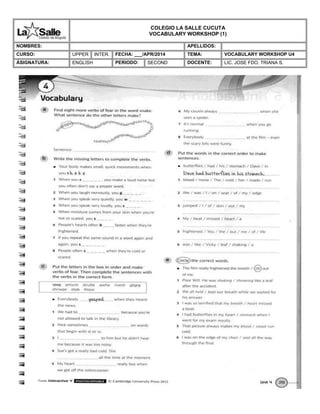This document is a vocabulary worksheet from Colegio La Salle Cucuta for an Upper Intermediate English class. It provides vocabulary exercises for Unit 4 and was assigned on April 2014 by the teacher Jose Fernando Triana for the second period class.