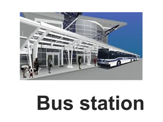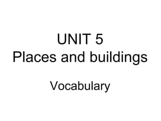 This document provides a vocabulary list of common places and buildings including a bus station, theatre, park, shopping mall, cyber café, and gym and also includes common location prepositions like on, on the corner of, next to, and in front of.