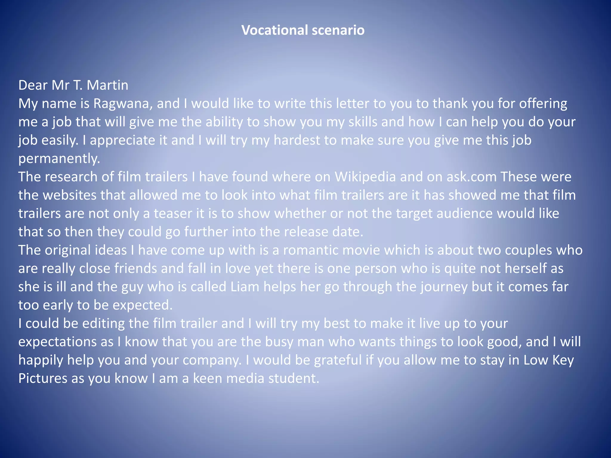 Ragwana thanks Mr. Martin for the job opportunity and promises to work hard to demonstrate their skills and make the job permanent. They researched film trailers on Wikipedia and ask.com, finding that trailers are meant to gauge audience interest in a film's release. Ragwana proposes editing a trailer for an original romantic film idea about close friends who fall in love as one deals with an unexpected illness. They are eager to edit the trailer to Mr. Martin's high standards and help his busy company as a keen media student.