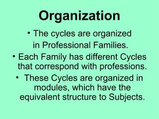 Vocational education in Spain has two main cycles - middle grade and superior level. The cycles are organized into professional families with different modules equivalent to subjects. Students can pursue vocational studies at a medium degree level after compulsory secondary education, studying for 2 years including practical classes outside of school. They can also pursue a high degree after obtaining a baccalaureate degree or test, such as an example program in administration of computer systems or mechanics, with theory classes in operating systems, programming, and networks in the first year and databases and more advanced programming in the second year along with 3 months of training at a company.