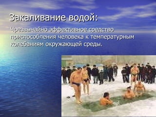 Документ описывает методы закаливания водой, включая обтирание, обливание, душ и купание, подчеркивая их эффективность для адаптации организма к температурным колебаниям. Для каждой процедуры указаны рекомендации по начальным и конечным температурами воды, а также продолжительностью. Основное внимание уделяется безопасности и постепенности в процессе закаливания, начиная с более теплой воды.