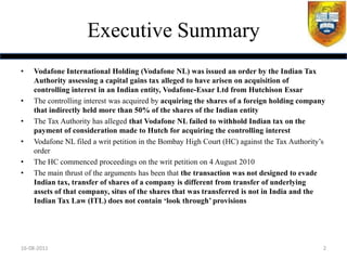 The document summarizes a tax case involving Vodafone being issued an order by Indian Tax Authorities for capital gains tax on its acquisition of an Indian telecom company. Vodafone appealed to the Bombay High Court arguing the transaction was not designed to evade tax and occurred between two non-resident entities. The High Court ruled in favor of the Tax Authorities, saying the transaction transferred underlying Indian assets. Vodafone is now appealing to the Supreme Court.