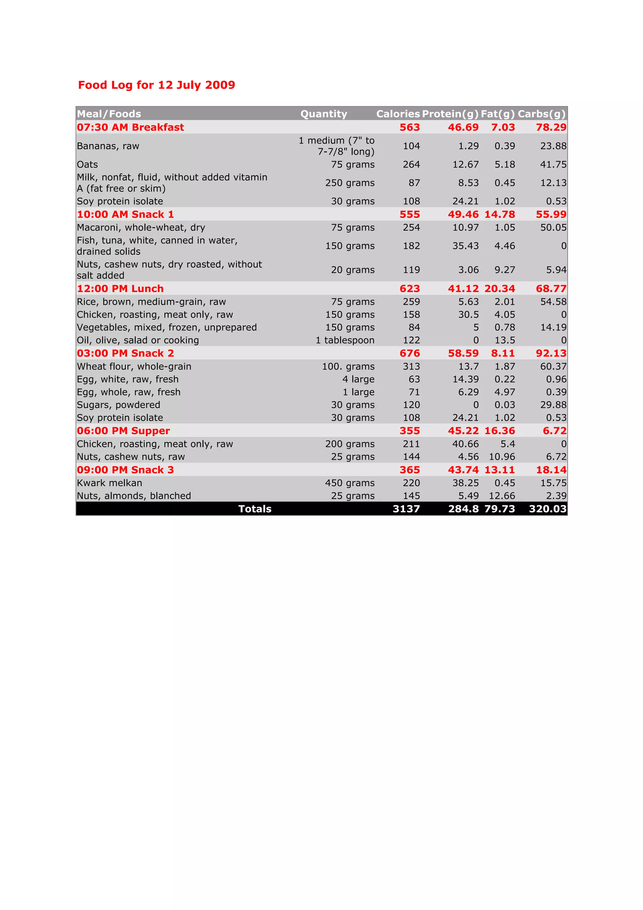 The document summarizes a person's daily food log from July 12, 2009. It lists 7 meals and snacks throughout the day totaling 3,137 calories, 284.8g of protein, 79.73g of fat and 320.03g of carbohydrates. The largest meals were lunch at 623 calories and a mid-afternoon snack at 676 calories, consisting mainly of whole grains, eggs, and protein sources.