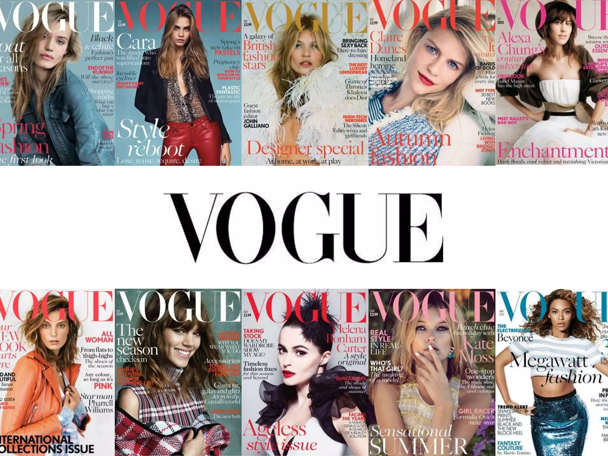 The document summarizes key aspects of Vogue magazine, including its typography, layout, content, and target audience. It notes that Vogue uses sans serif fonts that look chic and simple, features large celebrity photos on the cover, and has a color theme that relates to the season. The content consists mainly of fashion photos and advertisements with limited text. Vogue's target audience is females ages late 20s to 30s, though it also publishes men's and teen editions to reach other demographics.