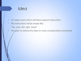 This document outlines a plan to create a bot that follows speech instructions. The bot will initially follow simple instructions like "go", "stop", "left", "right", and "back" using Google Speech for voice recognition and an Arduino board and motor circuit for movement. The plan is to eventually expand the bot to understand more complex commands.