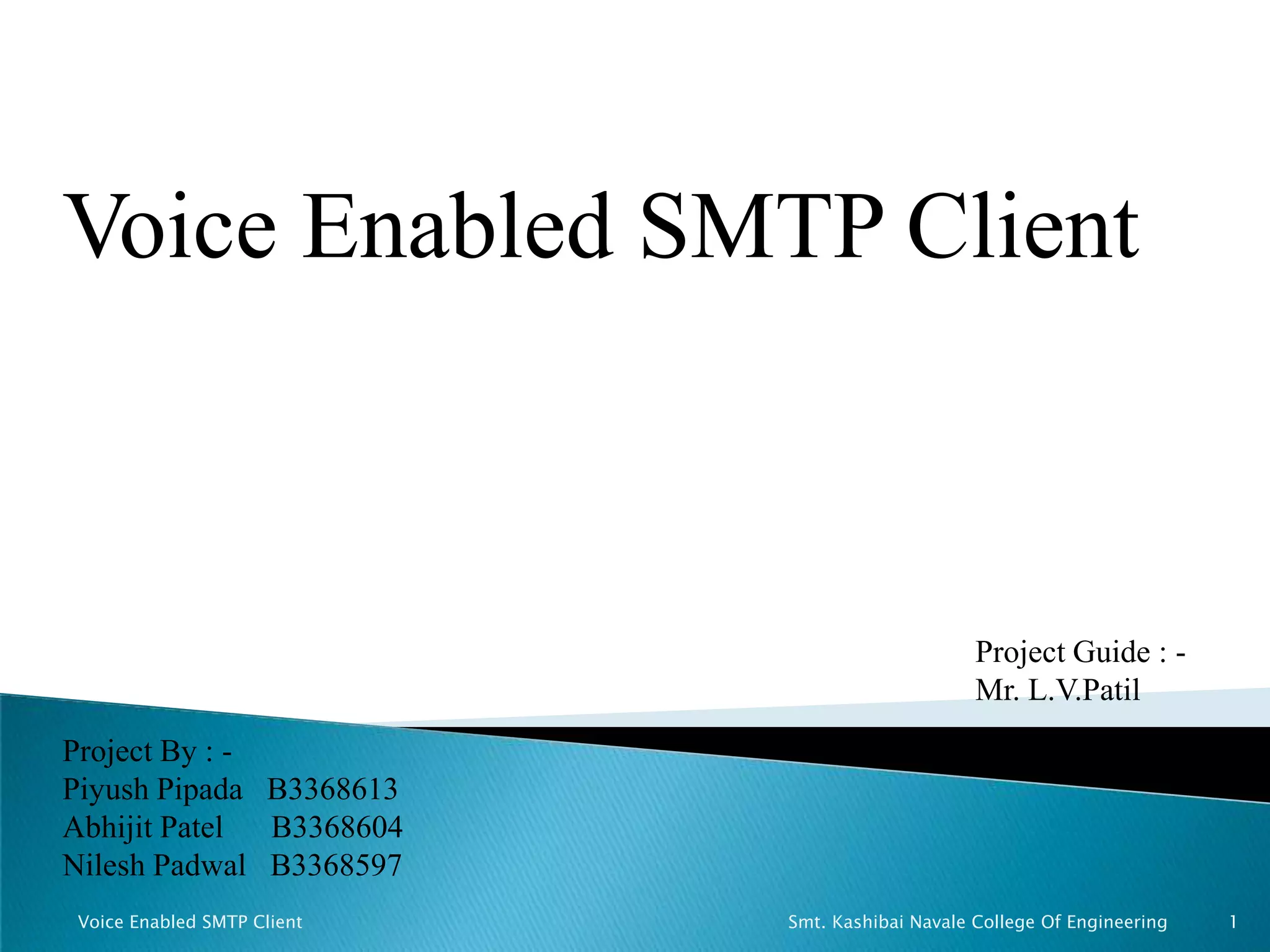 This document describes a voice enabled SMTP client project that allows users to control their email mailbox through voice commands without using GPRS. It provides mail alerts to mobile phones through SMS. The project uses Java Mail API to send and receive emails, a VB based SAPI module for speech to text and text to speech conversion, and an SMS alerts module. Some key features include sending emails using voice, reading received emails aloud, and managing contacts. It has advantages like being voice enabled and providing free mail alerts on mobile.