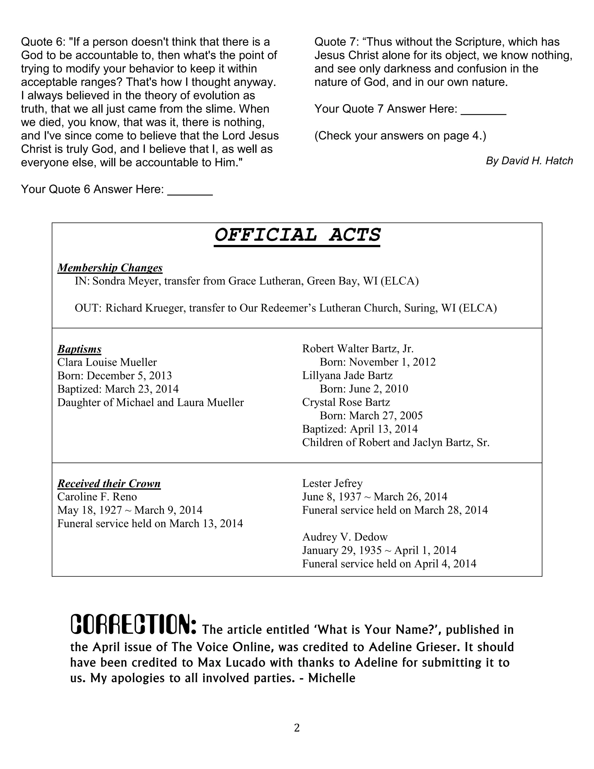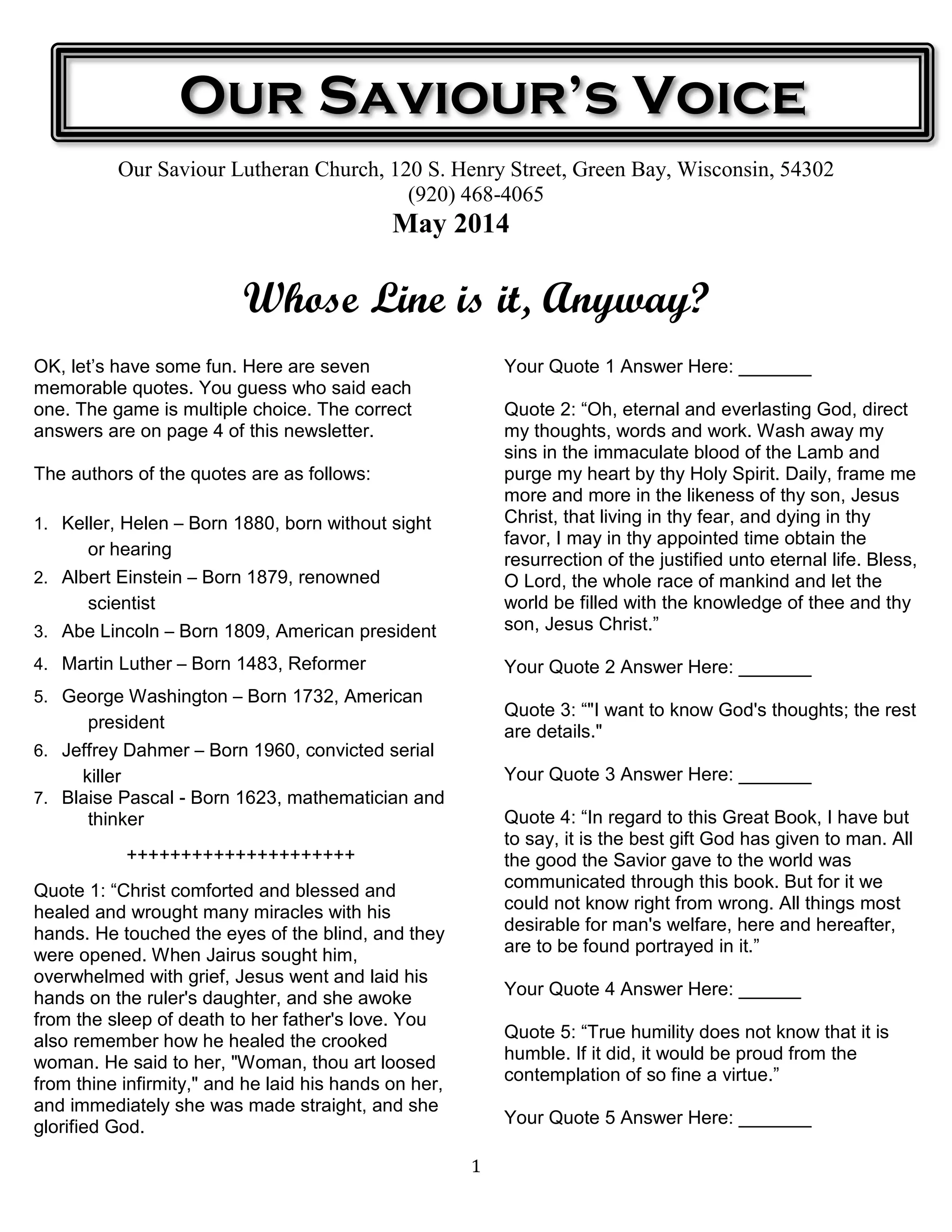 This document is a newsletter from Our Saviour Lutheran Church that includes: