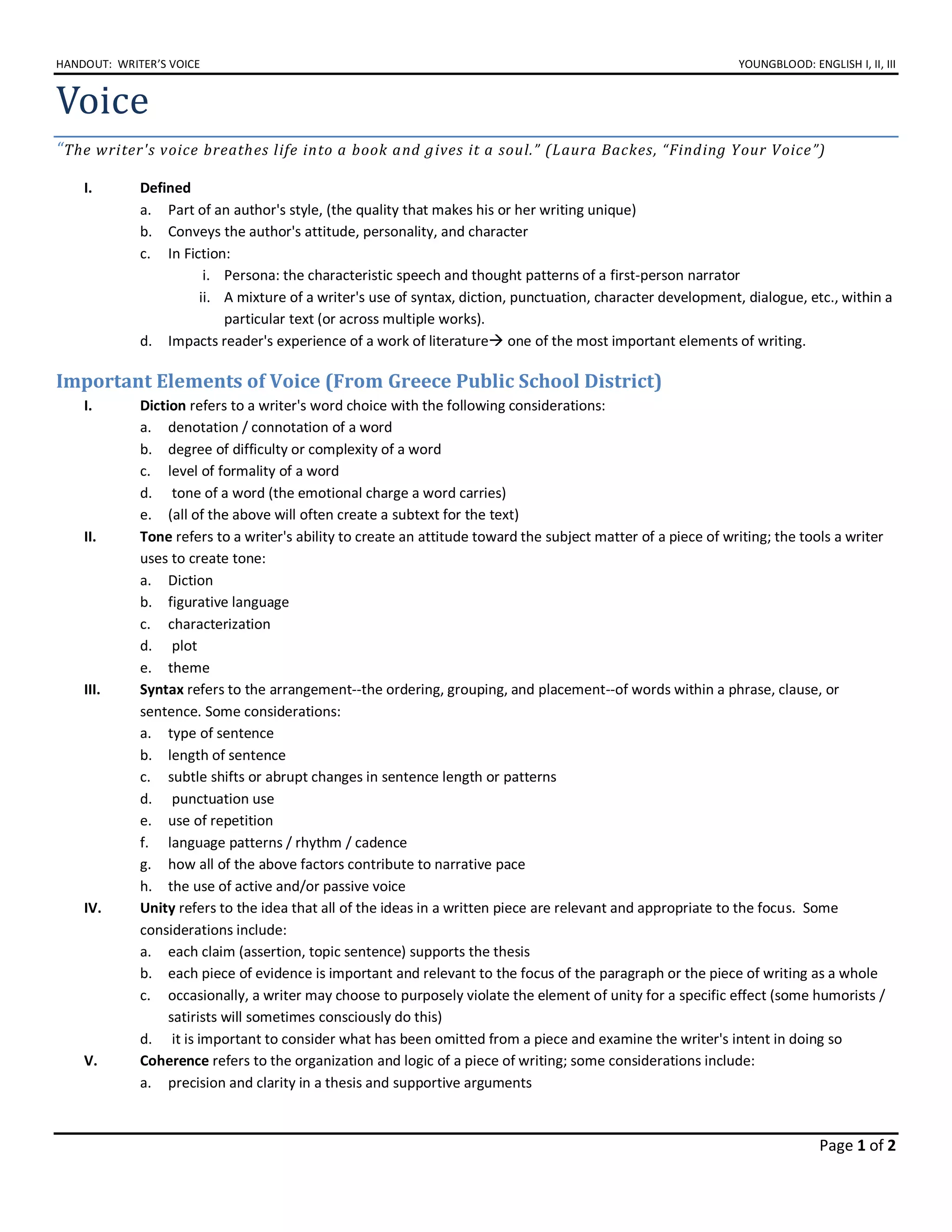 The document defines voice as an author's unique style that conveys their attitude, personality, and character through elements like syntax, diction, punctuation, and character development. Voice impacts the reader's experience of a work of literature and is one of the most important elements of writing. The document then discusses important elements of voice including diction, tone, syntax, unity, coherence, and audience awareness. It provides considerations for each element and how they contribute to an author's voice.