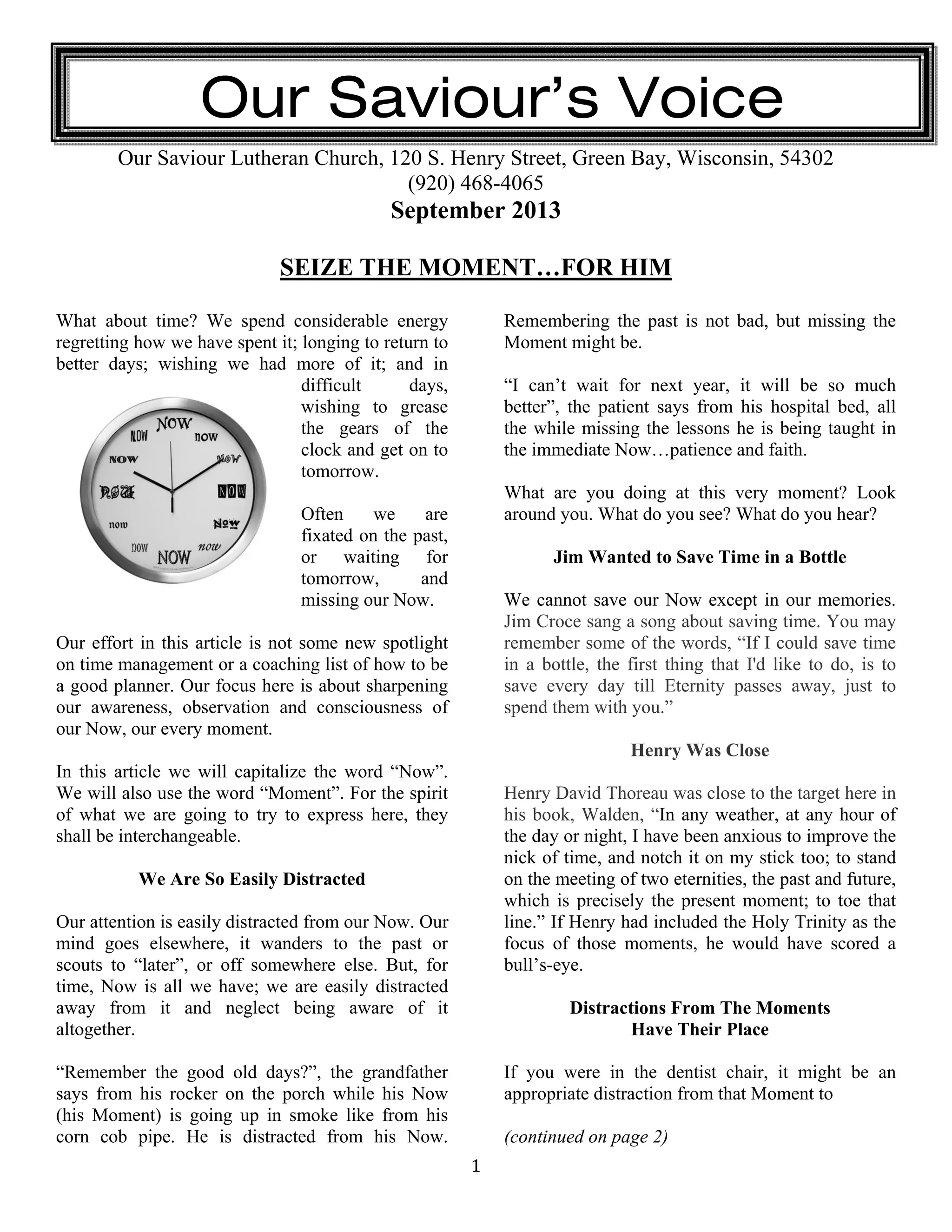 This document is a newsletter from Our Saviour Lutheran Church providing tips and encouragement to seize moments and live intentionally in the present. It discusses how easily distracted humans can be from the present moment and offers tools like using the senses to praise God in each moment. The newsletter emphasizes making the most of each gift of time that God provides.