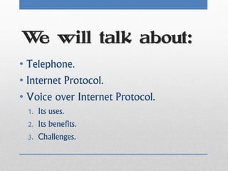 The document discusses VoIP technology, outlining its functions, benefits, and challenges. VoIP allows voice calls over the internet, offering cost savings and flexibility compared to traditional phone services but also faces issues such as quality of service, power dependence, and emergency call limitations. Additionally, it highlights the importance of security measures to protect VoIP communications from potential threats.