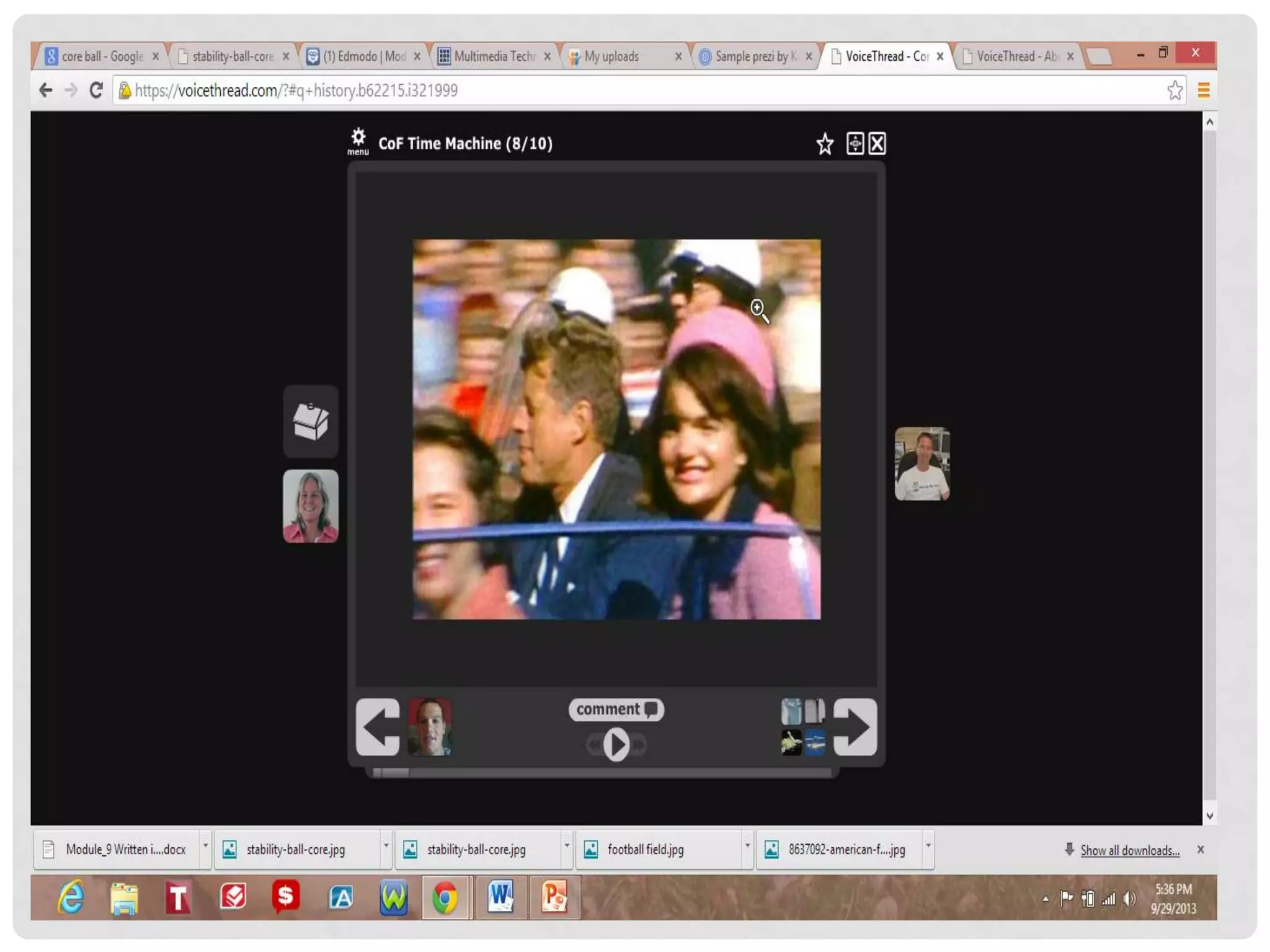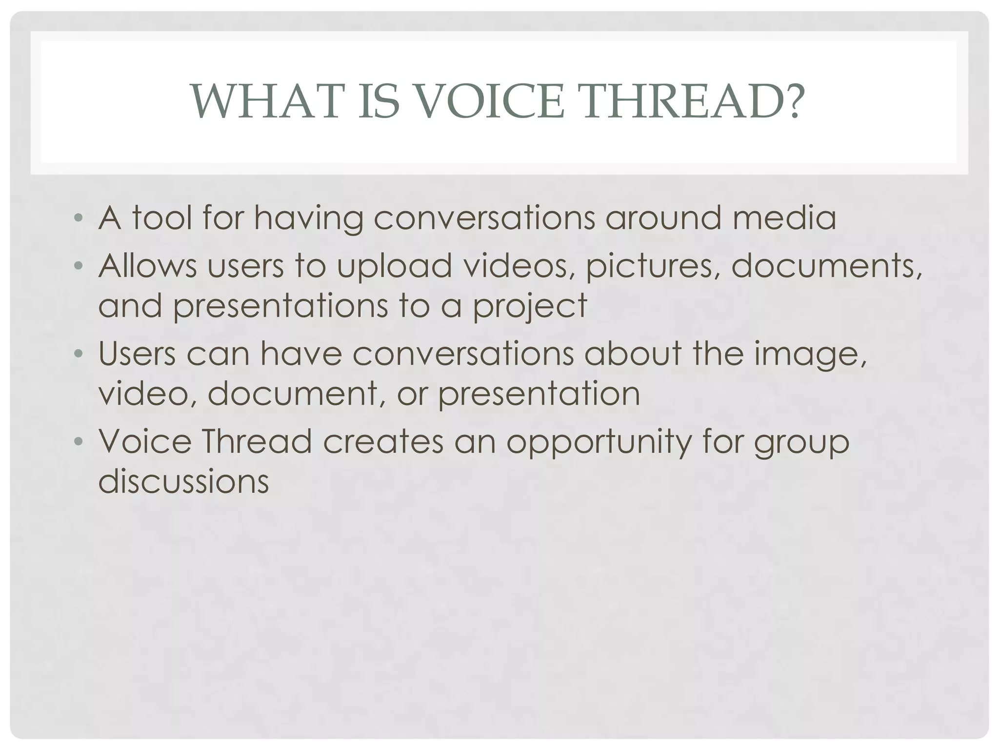 Voice Thread is a tool that allows users to have online discussions around media such as videos, images, documents, and presentations. Users can upload content to projects and then leave comments via text, audio, or video. Comments can be made using a telephone, webcam, microphone, or by uploading a file. Voice Thread facilitates group discussions and collaboration. It can be used for classroom projects, having students discuss solutions to math problems, historical events, or characters in literature. Examples provided discuss math problems, history timelines, and a science fair project on global warming. Voice Thread supports diverse learners by allowing visual and collaborative learning as well as creating individual work for peer feedback. Adaptions for different subjects are suggested. Helpful tutorial links