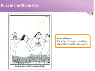 The document discusses the evolution and impact of word-of-mouth marketing, emphasizing its effectiveness compared to traditional advertising. It highlights the importance of product experiences and storytelling in generating buzz and consumer engagement. Various strategies, examples, and the significance of 'buzzers' in promoting products are included, illustrating how to turn negative perceptions into positive discussions.