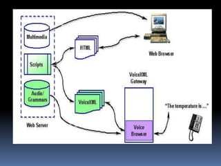 Voice XML is a standard XML format for specifying voice dialogs between humans and computers. It allows voice applications to be developed and deployed similarly to HTML for visual applications. Voice XML documents are interpreted by voice browsers to handle speech synthesis, recognition, and other voice interactions over the telephone. Some common uses of Voice XML applications include order inquiries, package tracking, directions, and more.